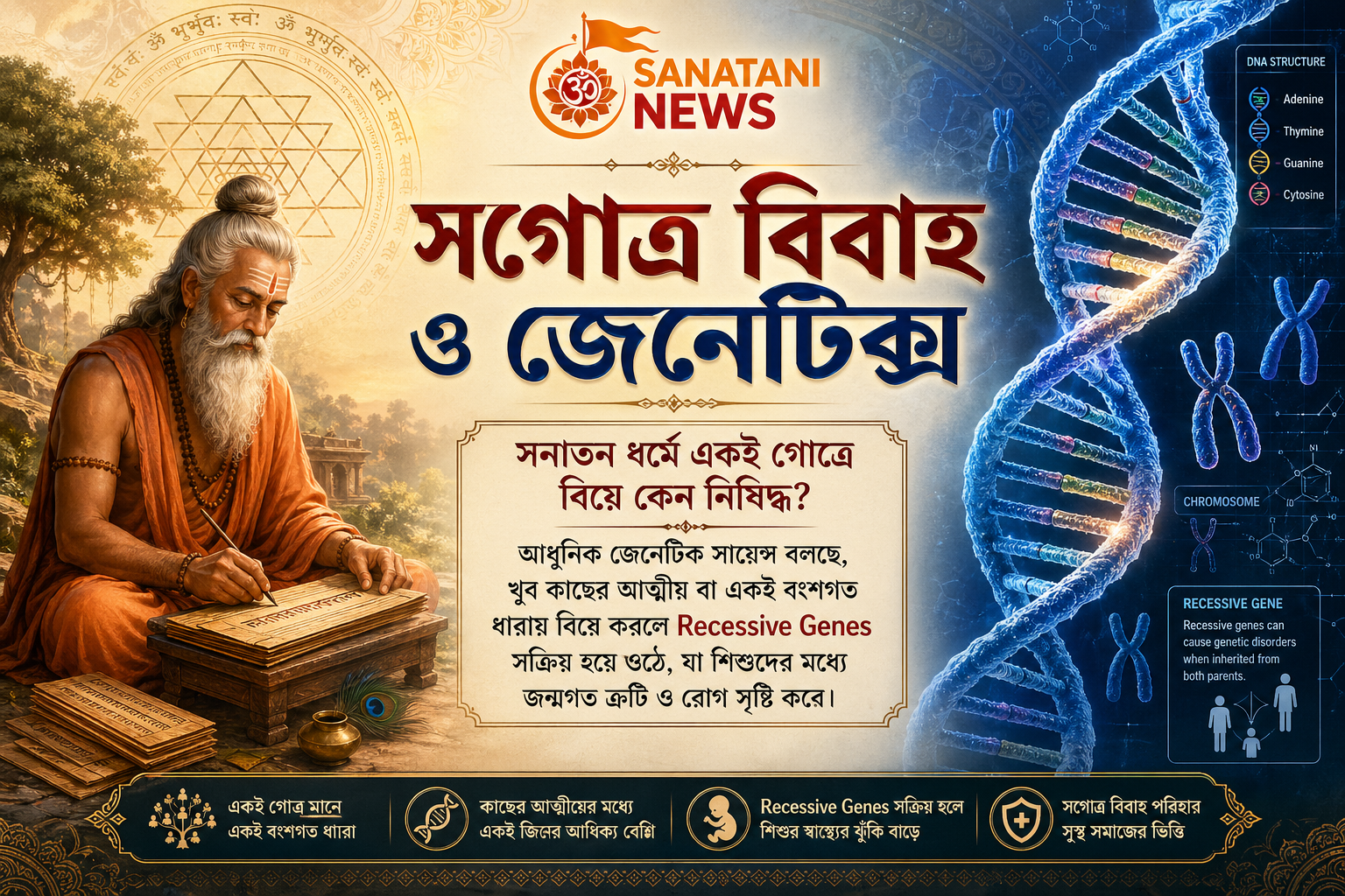 আধুনিক Genetic Science আজ বলছে, খুব কাছের আত্মীয় বা একই বংশগত ধারায় বিয়ে করলে Recessive Genes সক্রিয় হয়ে ওঠে, যা শিশুদের মধ্যে জন্মগত ত্রুটি ও রোগ সৃষ্টি করে। আমাদের ঋষিরা ডিএনএ ম্যাপিং জানতেন বলেই এই নিয়ম করেছিলেন।