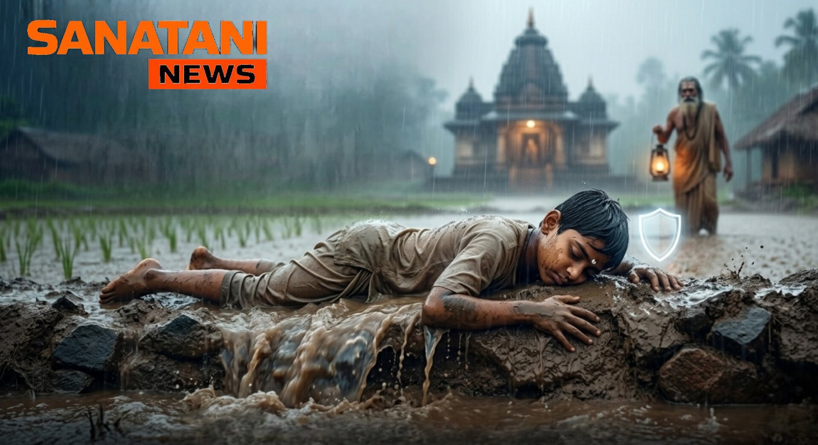 চাষের জমির আল (Embankment) ভেঙে জল বেরিয়ে যাচ্ছিল। জল বেরিয়ে গেলে ফসল নষ্ট হয়ে যাবে—এই Responsibility নিয়ে আরুণি রণক্ষেত্রে নামলেন।